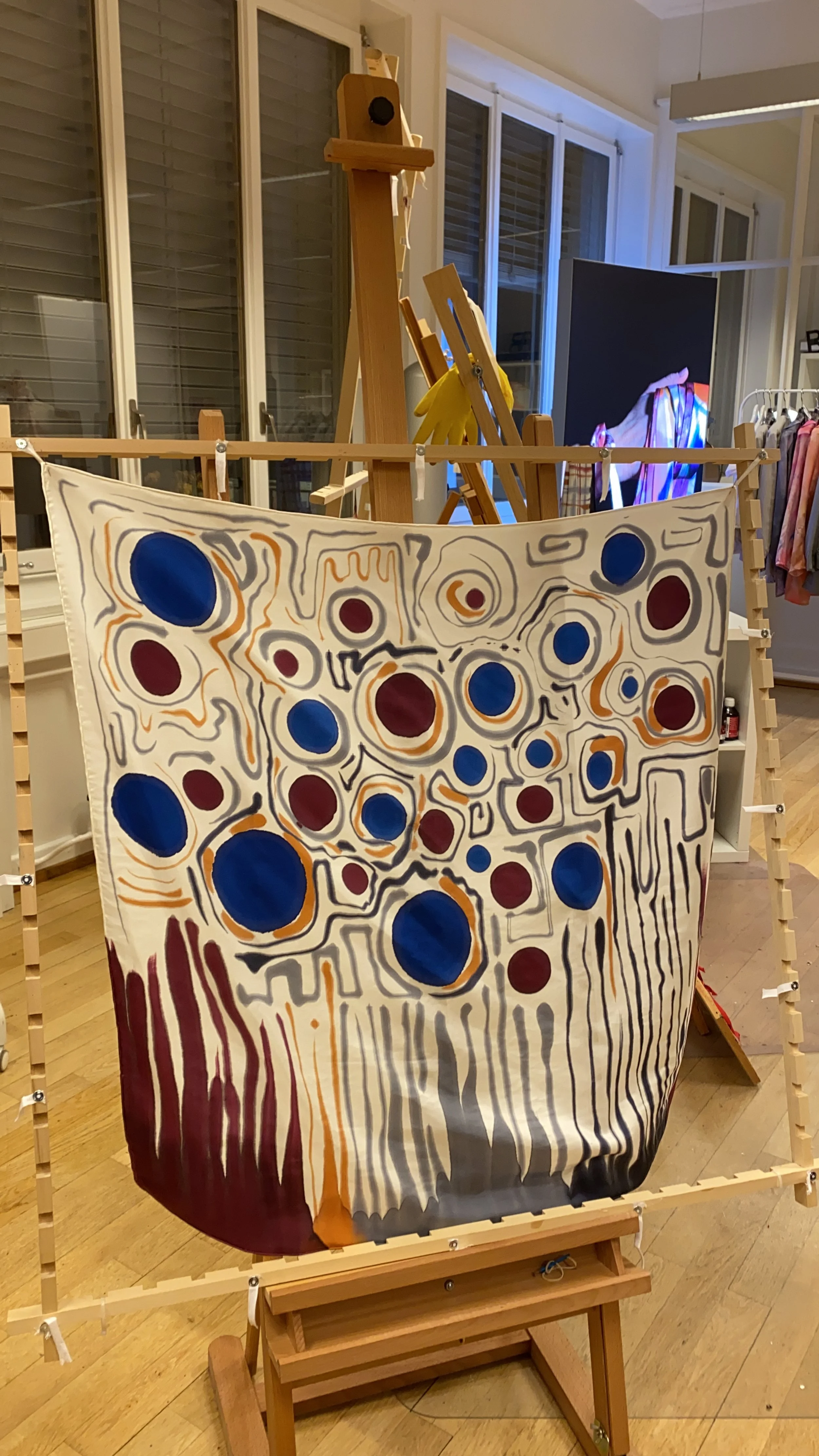 Création de pièce unique : Foulards, coussins et panneaux de séparations décoratifs peints à la main, chaque œuvre est une histoire en soi.